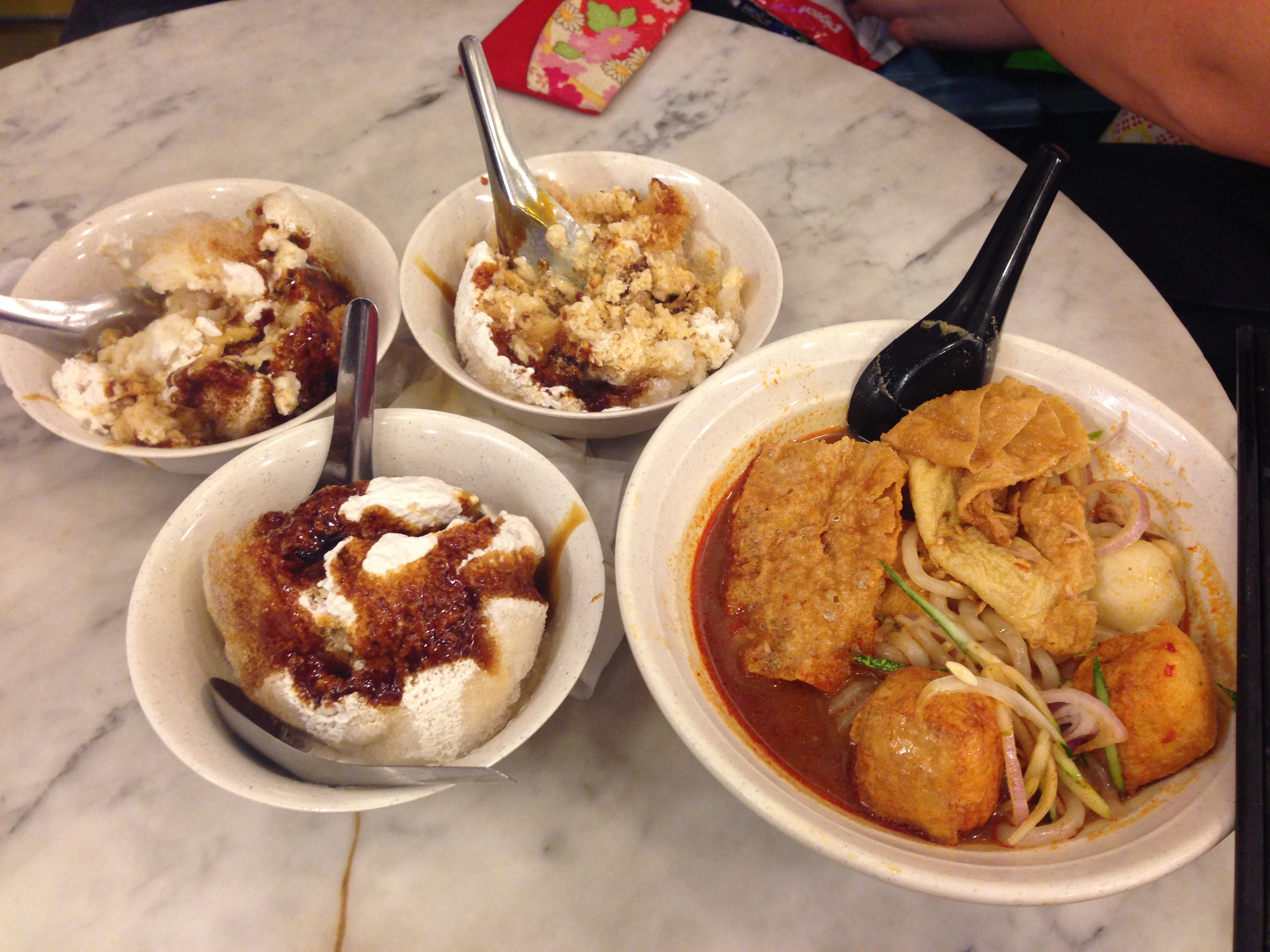 We had a list of recommended must-try food places and this trip has pretty much been a checking off of items of this list. The very 1st item that we tried was Chicken Rice Balls (no pictures because we were so hungry, we devoured the food before I thought of taking any photos), which Malacca is famous for and queues for this food can get pretty ridiculous. The most famous place that serves this is on Jonker Walk and is called Kedai Kopi Chung Wah, right at the top of Jonker Walk. Queues for its chicken balls can snake more than halfway to the river. We decided to try out Ho Kee Chicken Rice instead, which is 2 doors down from Chung Wah. The queue was decent, even at about 2pm, but the queue was kept moving and we were soon seated and our orders taken. Unlike Chung Wah, that only serves chicken rice, Ho Kee also has curry fish head and soups, but we kept it simple and went for the chicken rice and vegetables. The boiled chicken is served with both rice balls and loose rice, with a portion of chicken innards. I always had the impression that chicken rice balls had chicken wrapped in the rice, but sadly, this isn’t so. Even so, I pretty much liked it, the rice balls was soft and chewy and the chicken flavourful, although a bit tough. The innards were a delightful surprise, but that’s just me 🙂 That said, I still prefer Singapore’s Hainanese Chicken Rice more.