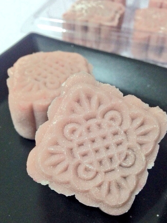 Overkill with the mooncakes? Maybe, but I’m on a roll here. Made strawberry-flavoured snowskin mooncakes with 2 different fillings – rum truffle and coffee tonight in just 1 1/2 hrs. I used the same recipe from my previous post with some tweaks; instead of cold water, I pureed some strawberries and mixed it with some ice cream soda. I read somewhere that using ice cream soda lets the snowskin stay soft and supple for longer. We shall see.